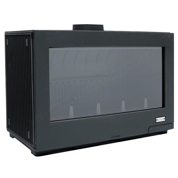 Poêle à bois Le Tendance – Bien qu’il ressemble à un insert, ce poêle ne peut pas être encastré dans une cheminée. N’étant équipé que d’une seule coque, il a été conçu pour diffuser la chaleur autour de lui. Il est donc destiné à être posé dans une grande cheminée ancienne – Habillage fonte peint anthracite – Régulation manuelle – Raccordement arrière ou dessus Ø 200 mm ext.